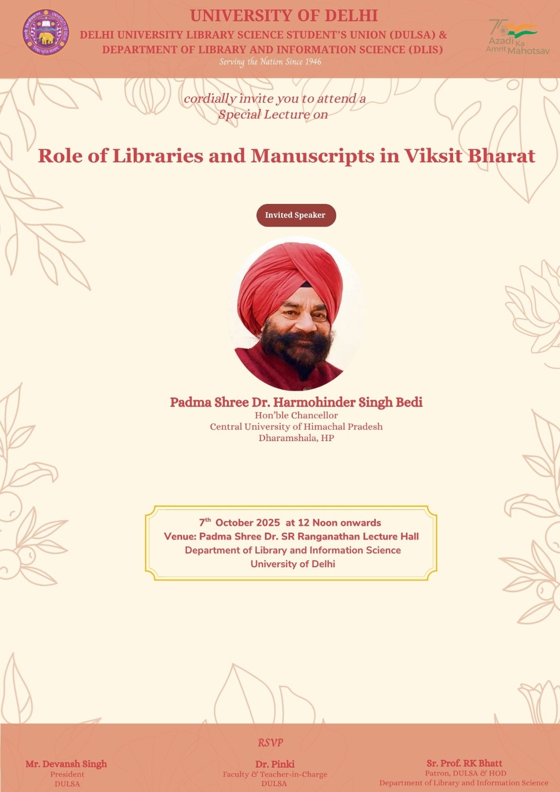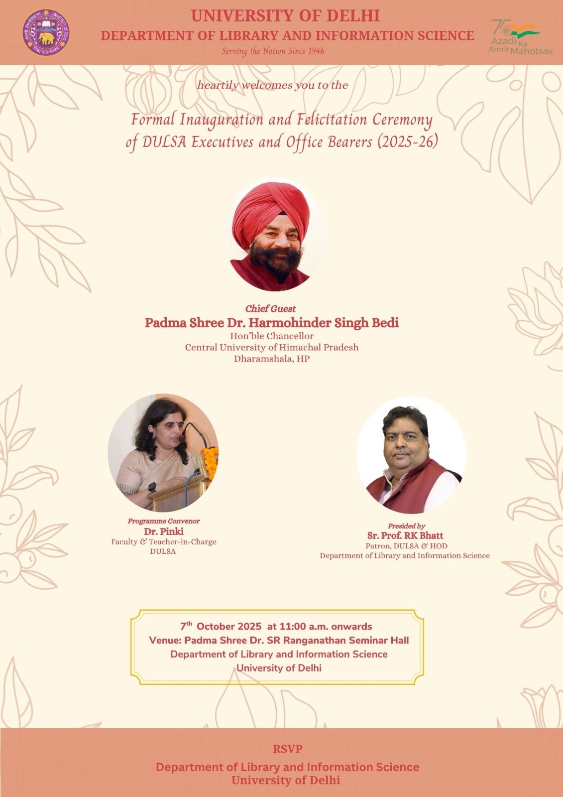 The Department of Library and Information Science (DLIS) was established in 1946 and became the first Department in the country to have a formal degree program in Library and Information Science. It had a venerable legacy and international acclaim for the highest academic standards, distinguished faculty, illustrious alumni, varied co-curricular activities, and modern infrastructure. It was the first Department in the whole Commonwealth countries to award the first PhD degree in Library Science in 1957 and was also the first in the world after the USA to have a Master's program in Library Science in 1950.