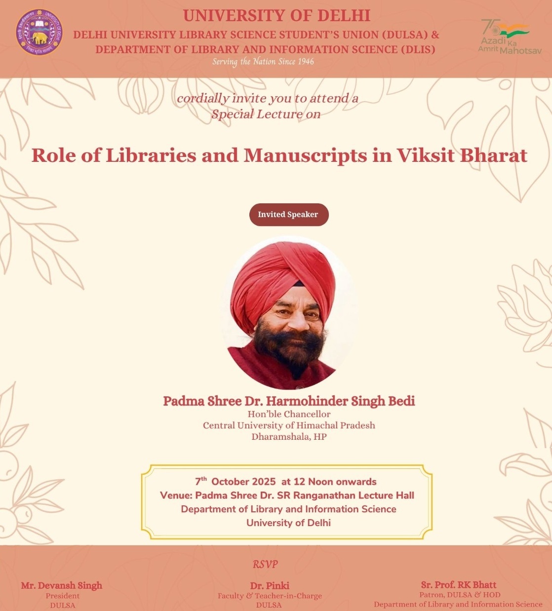 The Department of Library and Information Science, University of Delhi, had the honour of hosting Padma Shri Prof. Harmohinder Singh Bedi Ji, Hon'ble Chancellor of the Central University of Himachal Pradesh, for a special lecture on "The Role of Libraries and Manuscripts in Viksit Bharat" on 7 October 2025 in the Department.